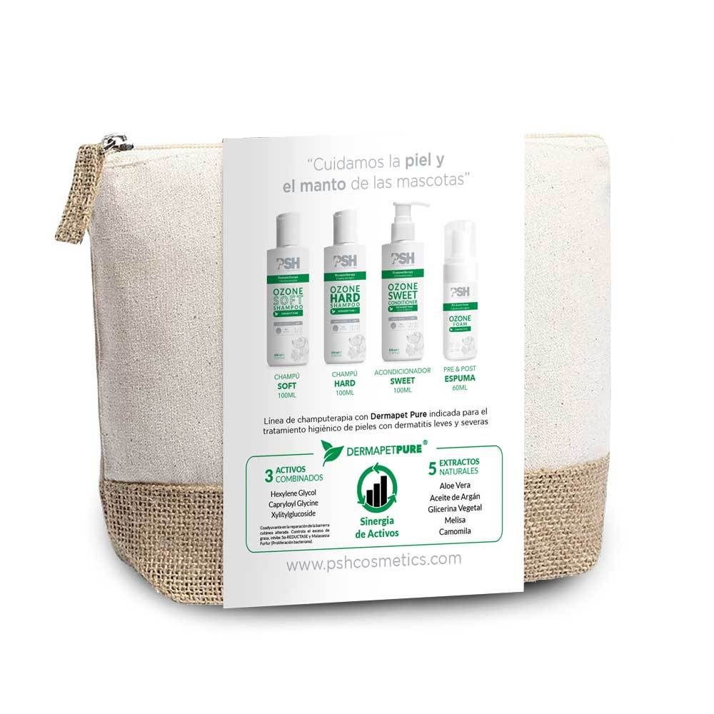 Kozmetická sada PSH Ozone Pack pre psov a mačky. Určená na šampónovú terapiu, podporuje regeneráciu citlivej, podráždenej pokožky. Pomáha pri starostlivosti o pokožku postihnutú rôznymi ochoreniami: seborea, suché lupiny, začervenanie, drsnosť, keratóza, praskanie, pupienky atď. Vhodná na pravidelné kúpanie alebo na použitie s ozonátorom / ozónovým kúpeľom.