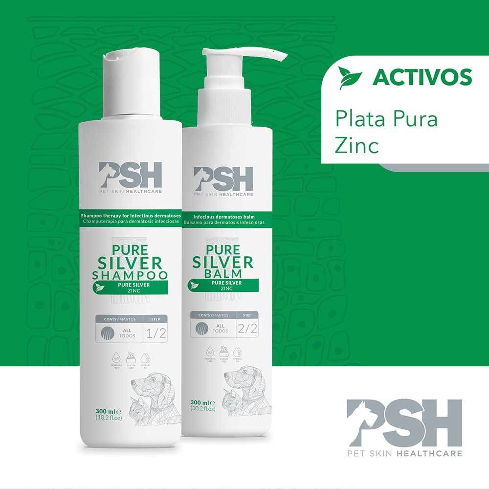 Šampón rovnomerne naneste na vlhkú srsť, nechajte pôsobiť 5-7 minút a dôkladne opláchnite. Pre optimálne výsledky postup zopakujte. Pre lepšie výsledky použite kondicionér PSH Silver Balm po kúpaní.